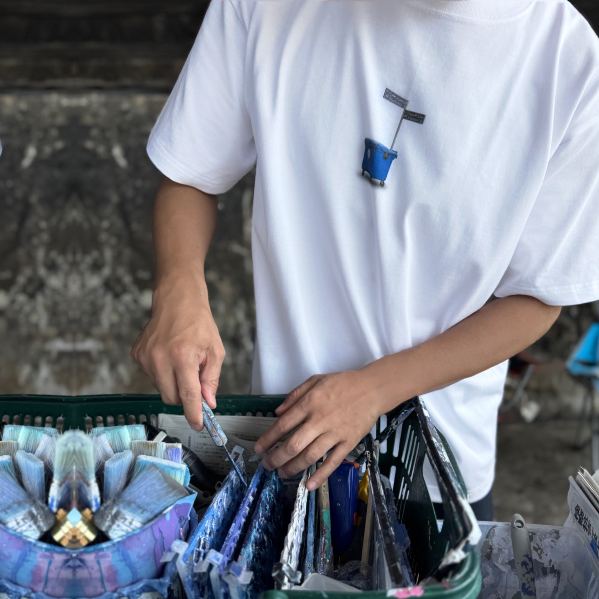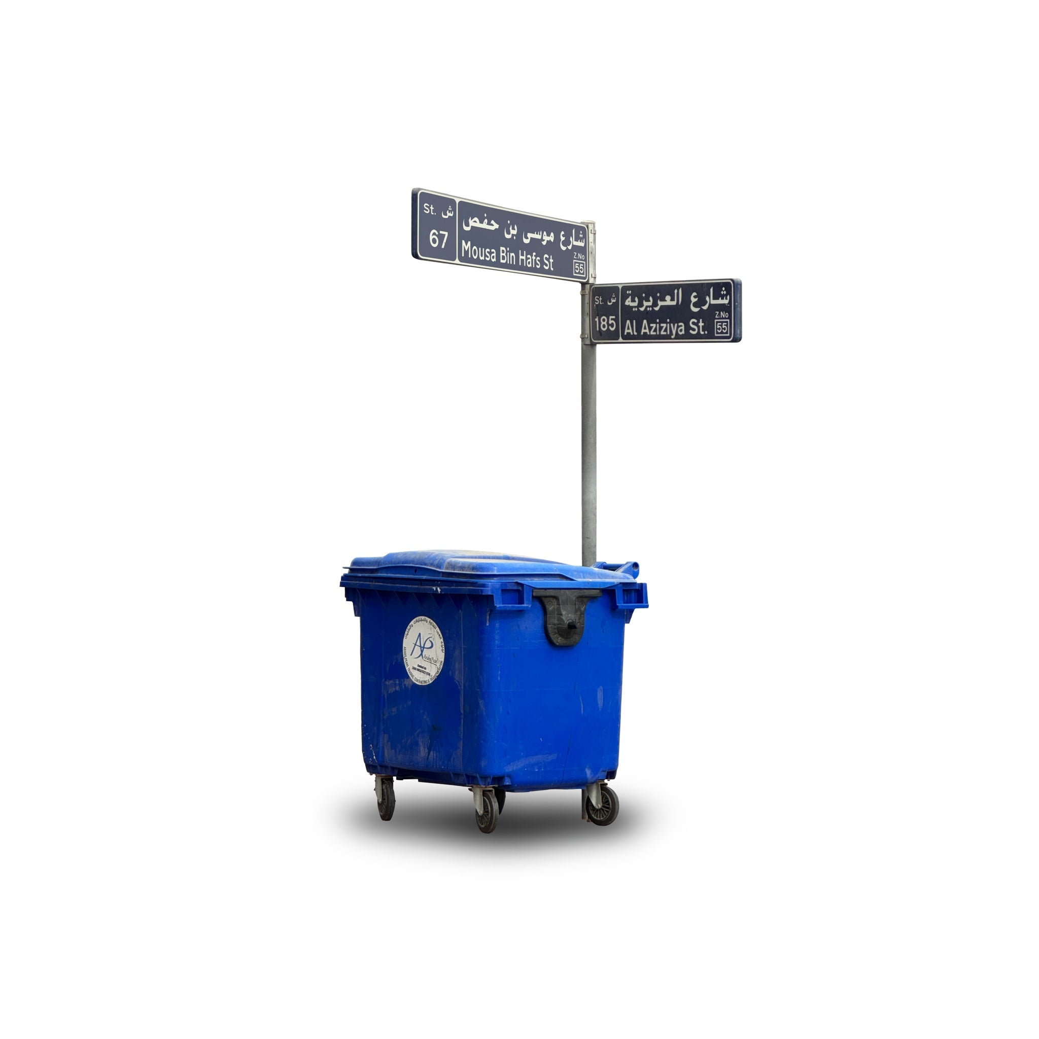 The front includes a street sign and a blue trash bin found at the site.